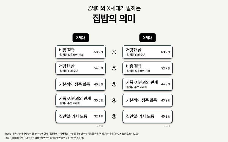 20대에게 집밥의 의미(복수 응답)를 물어본 결과, 비용 절약을 위한 실용적 선택(58.2%)이라는 응답이 1위로 건강한 삶을 위한 관리 수단(2위, 54.5%)이라는 응답보다 소폭 높았다. 이어 기본적인 생존 활동(40.8%), 가족·지인과의 관계를 이어주는 매개체(35.5%), 필수로 챙겨야 하는 집안일·가사 노동(32.1%)이라는 응답이 뒤이었다.