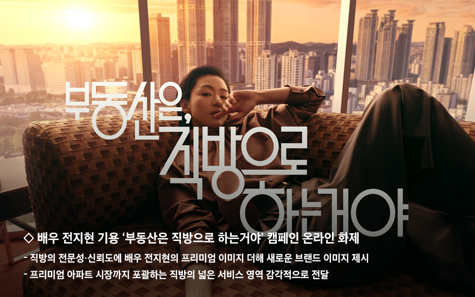 ‘부동산은 직방으로 하는거야’를 타이틀로 한 이번 캠페인은 고급스러운 이미지의 배우 전지현을 브랜드의 얼굴로 내세웠다. 캠페인 영상은 전지현의 새로운 집을 보러 온 동생과의 대화로 시작된다. 좋은 집을 고른 직감을 부러워하는 말에, “부동산은 직감이 아닌, 직방으로 하는 거야”라고 응수하며, 감(感)에 의존한 결정이 아닌 데이터와 정보를 기반으로 한 현명한 부동산 거래의 중요성을 강조한다.