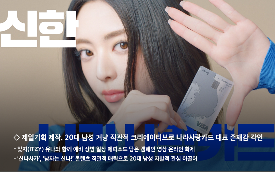 20대 남성들에게 호감도가 높은 있지(ITZY) 유나를 광고모델로 기용한 이번 캠페인은 군 입대를 앞둔 남성들의 일상 모습을 시트콤처럼 유쾌하게 그려내며 나라사랑카드의 다양한 쓰임을 복잡한 설명 없이 직관적으로 전달하는 데 초점을 맞췄다.