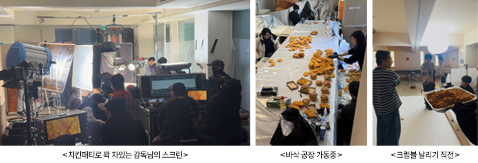 제품, 이름, 컨셉 모든 게 “더 바삭해졌다”를 향해 달려가는 광고. 촬영 현장은 그야말로 바삭 공장이었다. 노윤서 배우의 먹는 씬 뿐 아니라 퀄리티 있는 씨즐컷을 위해 쉬지 않고 패티가 튀겨졌고 버거가 만들어졌고 크럼블이 날아다녔다. 가장 두툼하고 바삭해 보이는 패티를 위해, 크럼블이 패티에 완벽하게 부딪치는 순간을 위해 늦은 밤까지 고생하신 감독님과 푸드팀, 모든 스탭분들께 큰 감사를 드린다