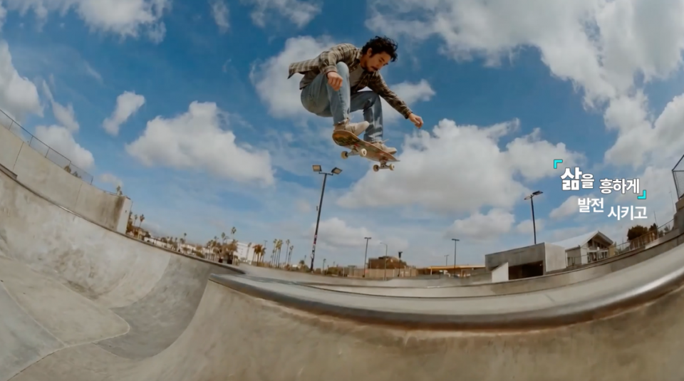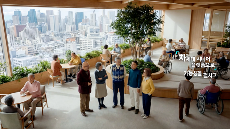 이번 캠페인은 제작의 70% 이상을 AI로 구현했다. 시니어 타운이 지어지는 장면과 그 안에서 생활하는 시니어들, 스케이트보드를 타는 남성, 근력 운동을 하는 여성, 그 뒤를 채우는 배경들까지 모두 AI로 만들었다. 일반 촬영으로는 불가능하거나, 가능하더라도 비현실적인 비용이 드는 장면들이다.