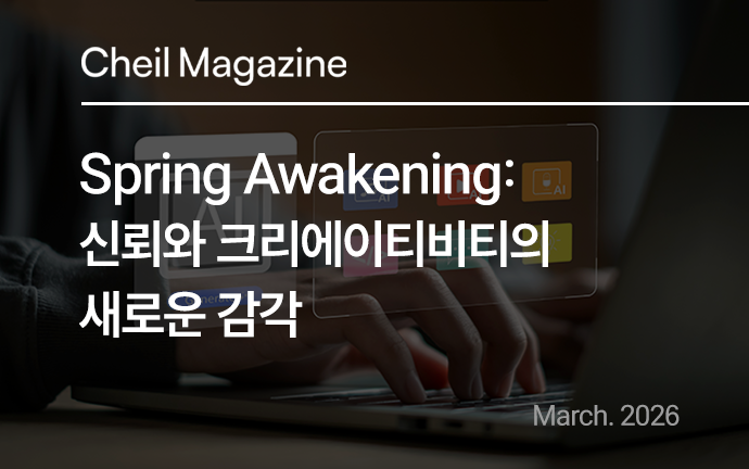 새로운 계절, 제일 매거진이 더 선명한 시각으로 여러분을 찾아갑니다. 전 세계를 무대로 활약 중인 글로벌 제일러(Cheil-er)들의 날카로운 인사이트부터, 제일기획만의 독창적 캠페인 빌드업까지 현장의 치열한 호흡을 담아냈습니다. 콘텐츠를 제작하기 쉬워진 AI 시대, 이제는 양적 팽창이 아닌 ‘신뢰’가 중요해졌습니다. 시대의 파도 속에서도 변치 않는 헤리티지 브랜드이 지켜 나가는 '플랫폼'의 힘, 그리고 톱스타의 유명세에 의존하지 않고 날카로운 '아이디어'로 승부하는 광고의 본질을 이야기합니다. 제일기획의 크리에이티비티가 선명하게 각인된 세 가지 신(Scene)도 조명합니다. 140년을 관통하는 KT의 연결 철학, 플레이리스트에 자연스럽게 스며든 BYD 돌핀의 시티팝 브랜딩, 기묘한 세계관으로 독보적 팬덤을 만든 하림 오드그로서까지, 제일 매거진과 함께 감각의 본질을 깨워 보세요.